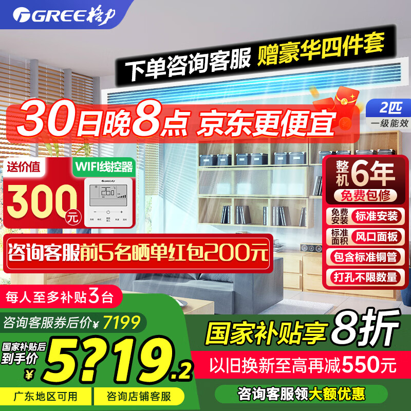 格力(GREE)中央空调家用Ka 系列2匹风管机一拖一变频冷暖1级能效WIFI智控FGP5Pd/KaNh-N1