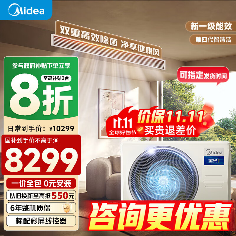 美的(Midea)风管机3匹一级能效【国家补贴直降20%】一拖一星光全屋智联 客厅隐藏式全直流变频 中央空调 4匹 一级能效 星光旗舰版39-55㎡